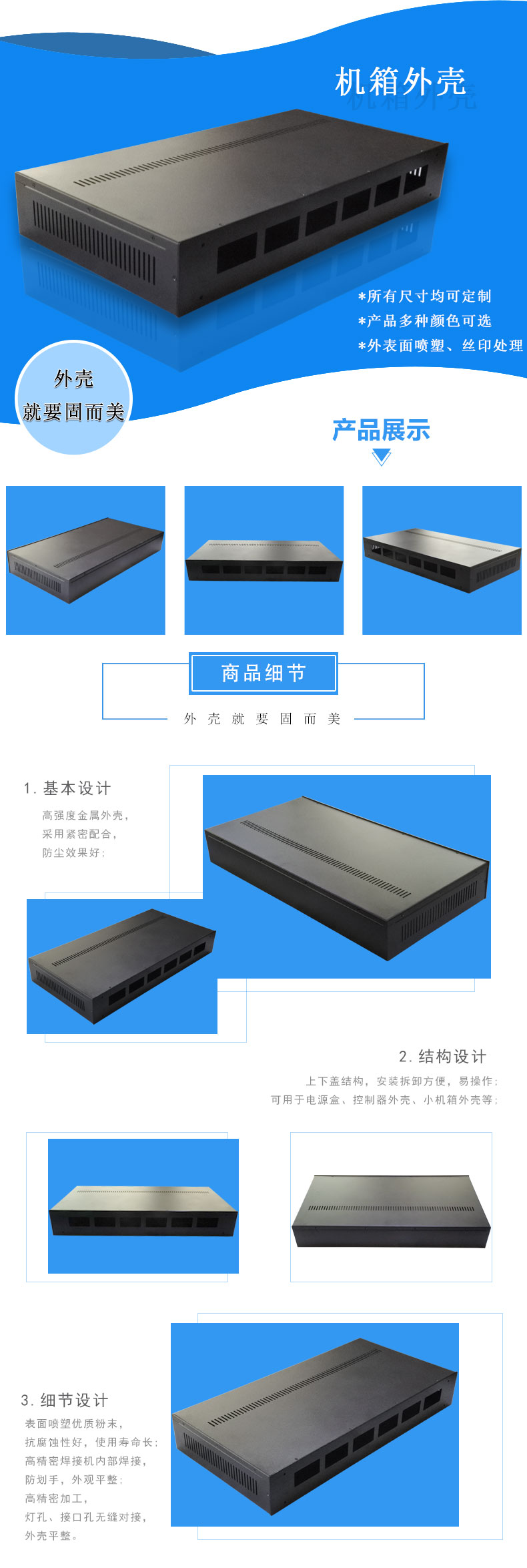 * 此款外殼適(shì)用於機箱外殼,工控服務機箱外殼,非標金屬機箱外殼定(dìng)做,大機箱外殼來圖來(lái)樣設計。 * 產品(pǐn)材料:鍍鋅板 * 盒體采用開孔合理,免工具(jù)安裝 * 表麵可(kě)噴塑,絲印(yìn) * 產品(pǐn)顏色和材料批量可(kě)訂製 * 所有(yǒu)尺寸(cùn)均可按要(yào)求修改