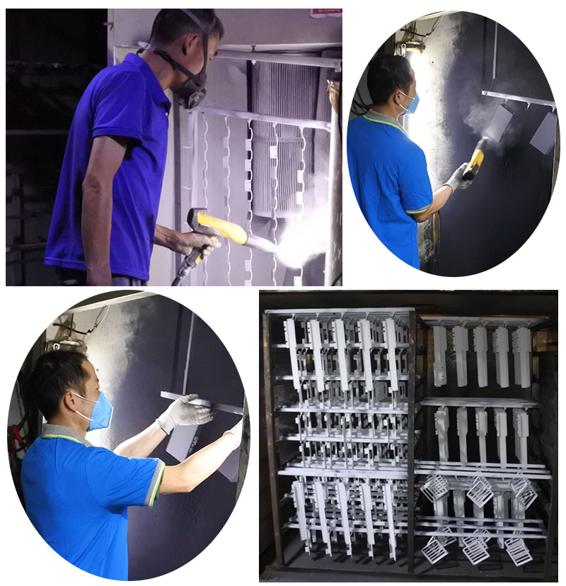 2、用(yòng)靜電粉(fěn)末噴(pēn)塗機對產(chǎn)品進行粉末噴塗,在高壓靜電環境下,粉末帶負極性,粉(fěn)末通過靜電噴塗槍,形成帶電粒子吸附在產品上。